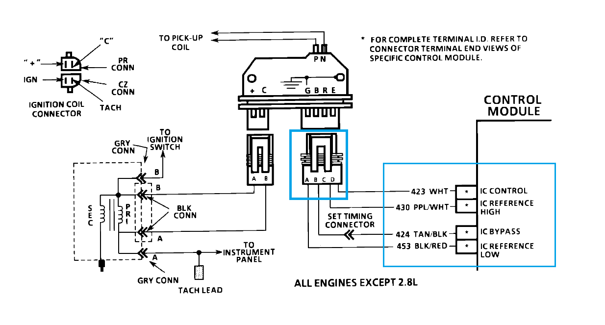 This is the better of the two wiring diagrams, so check the wiring from the ignition module to the PCM and make sure you don't have any corroded connectors or broken wires. You can see that the ignition module is completely in control of ignition spark if the timing connector is unplugged. This is because the pick-up coil goes to the ignition module first and then outputs it to the PCM. This is a very basic system. So, check all the PCM grounds for corrosion as well. With an older vehicle there is bound to be grounds that are not in great condition.