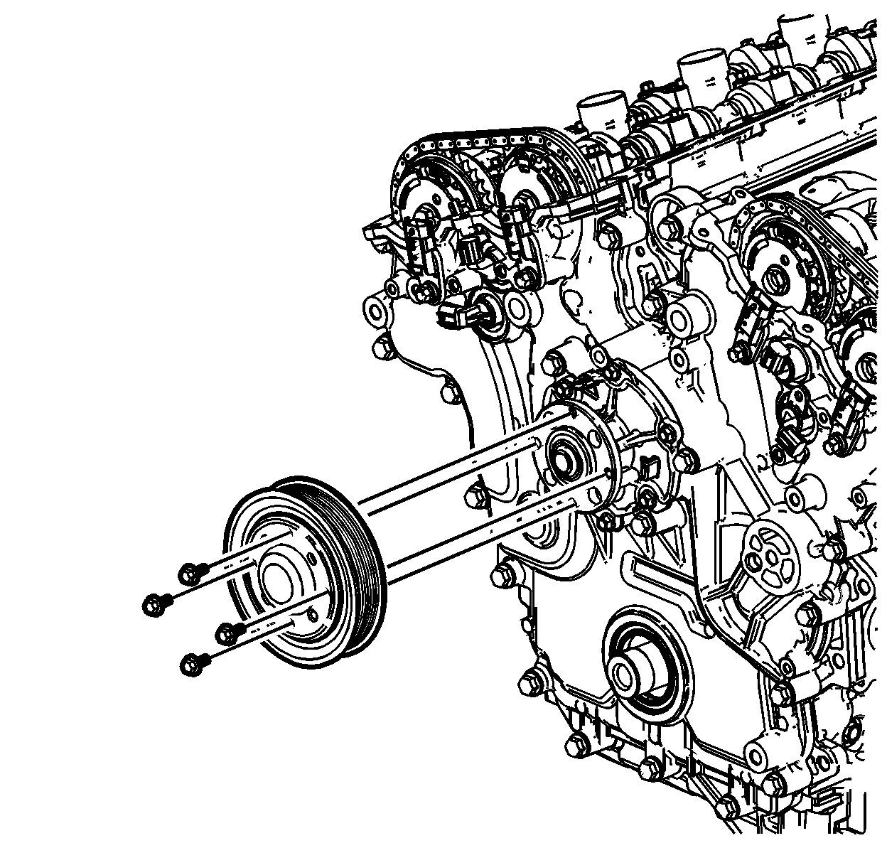 4. Remove the water pump pulley bolts and DISCARD the bolts.