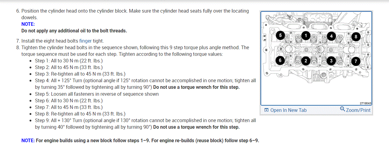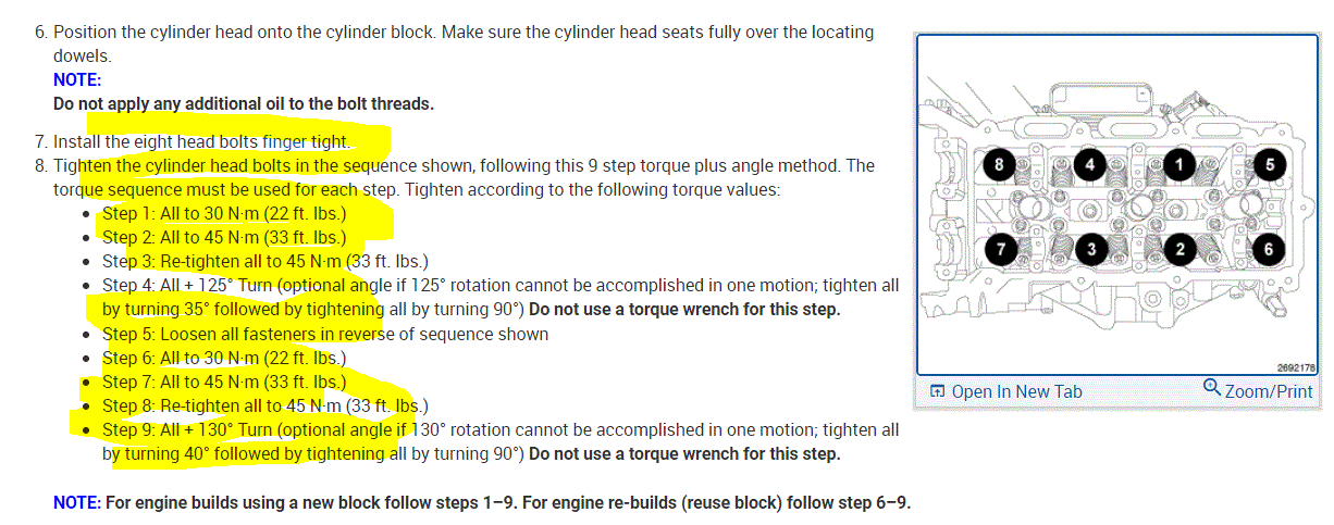 The first five pics below provide the torque specs for everything on the engine. The remaining pics are the directions for installing each cylinder head. Note that the torque specs are included in the directions and require a procedure to perform. There are a few steps.