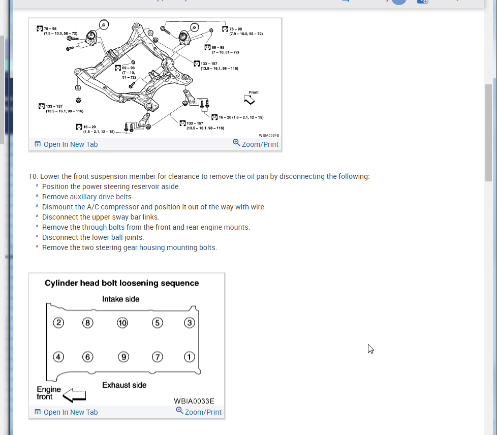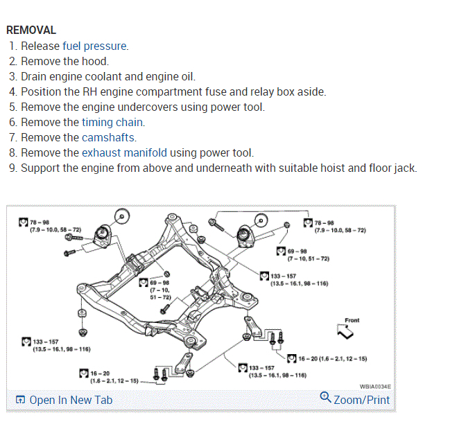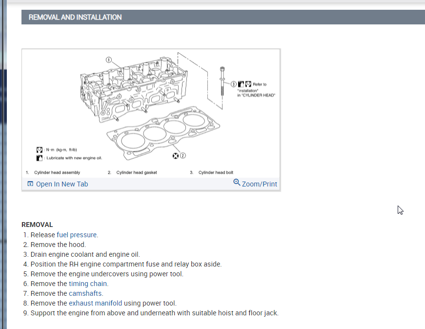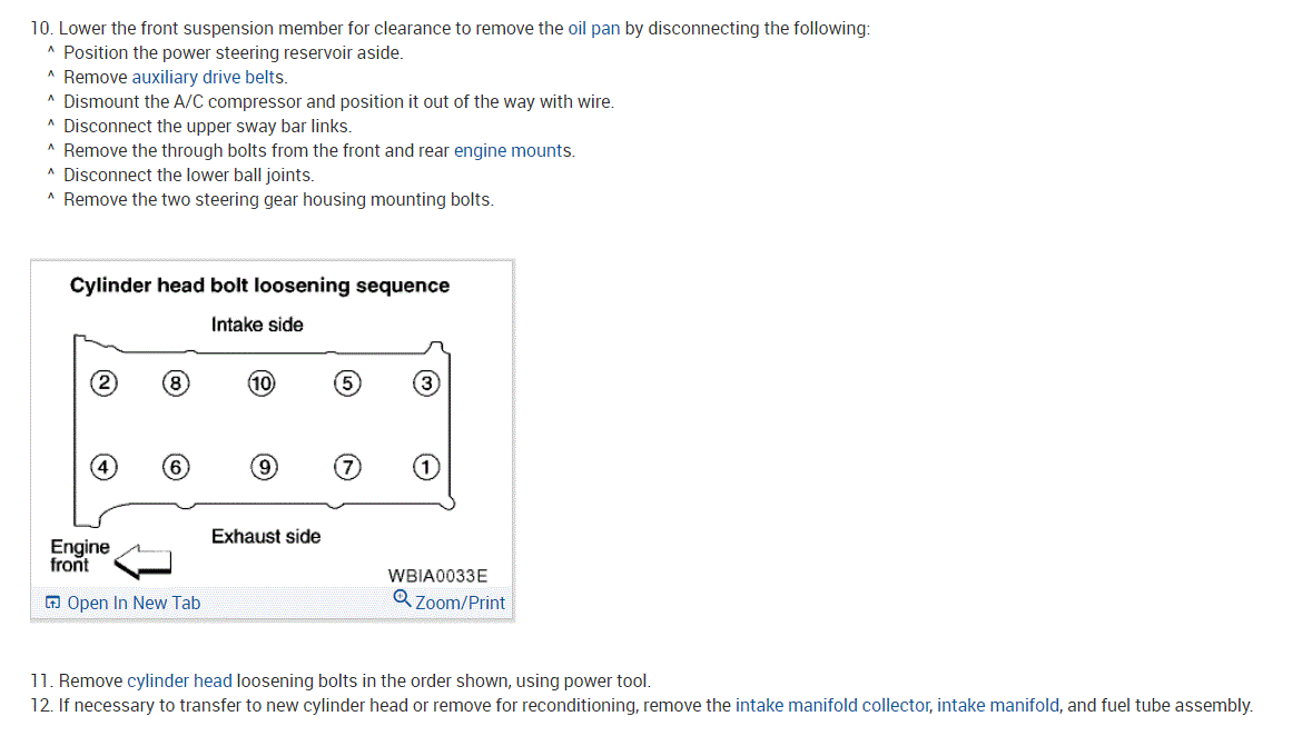 Note: The directions are showing the engine being removed. I believe you should be able to support the engine and transaxle, remove motor mounts and then remove the head without removing the engine. It will be tight on the timing chain side, so you may find it helpful to remove the inner fender and right-front tire (timing chain side) so you can access things easier.