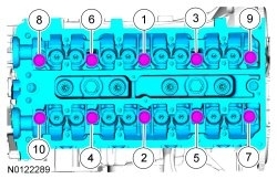 Install the cylinder head gasket, cylinder head and 10 new bolts. Tighten the bolts in the sequence shown in 4 stages: