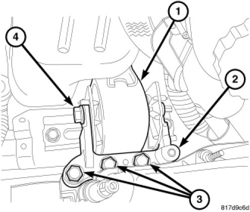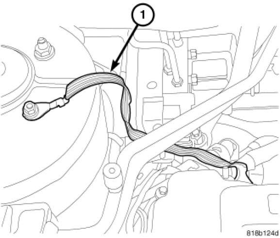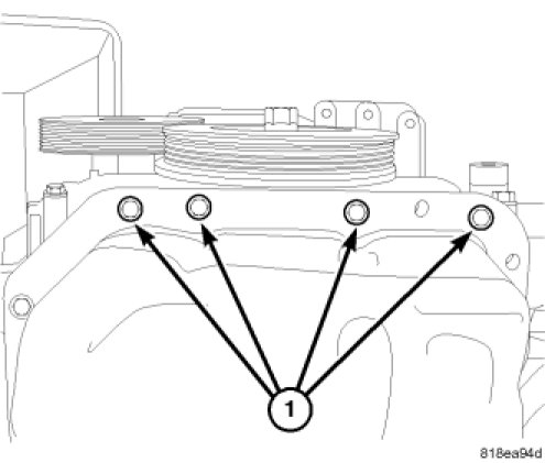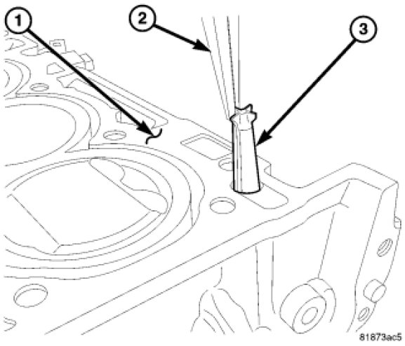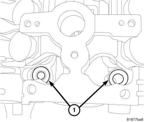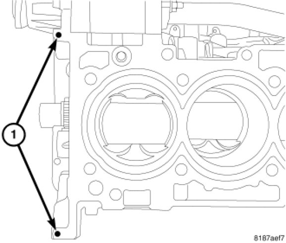 2. Place two pea size dots of Mopar(R) engine sealant RTV or equivalent (1) on cylinder block as shown.