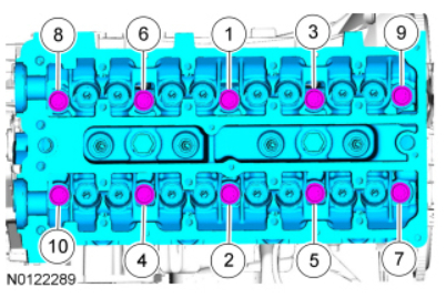 Install the cylinder head gasket, cylinder head and 10 new bolts. Tighten the bolts in the sequence shown in 4 stages: