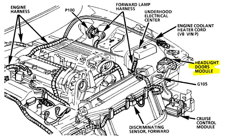 The module and the door motors have power at all times. When the headlights are turned "on", ground is applied to the relay coil within the Headlight Doors Module. The relay contacts close, and voltage is applied to the Headlamp Door Motor Assemblies. Ground is provided for the motors through the solid-state circuitry until the Headlamp Doors are open.