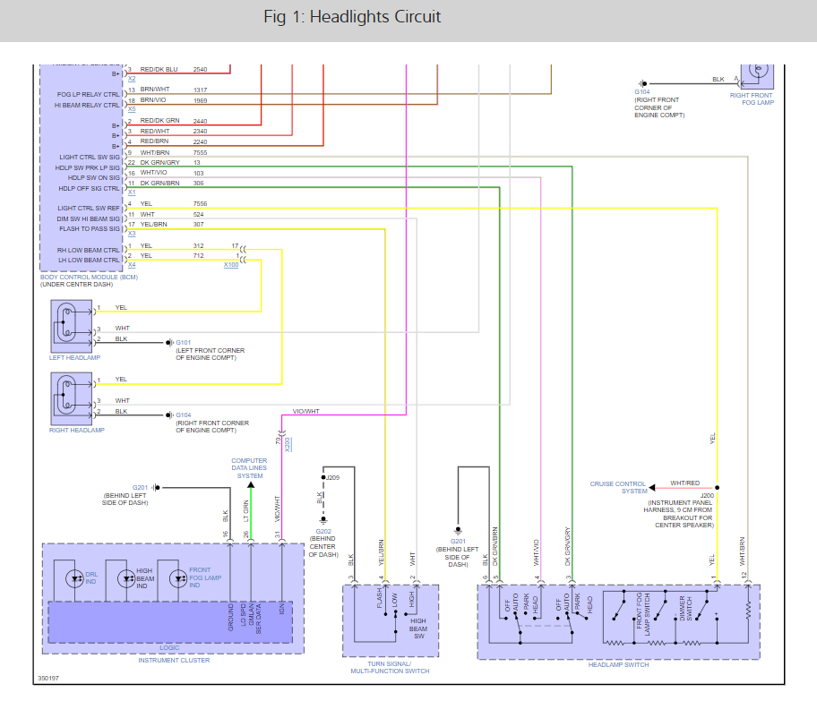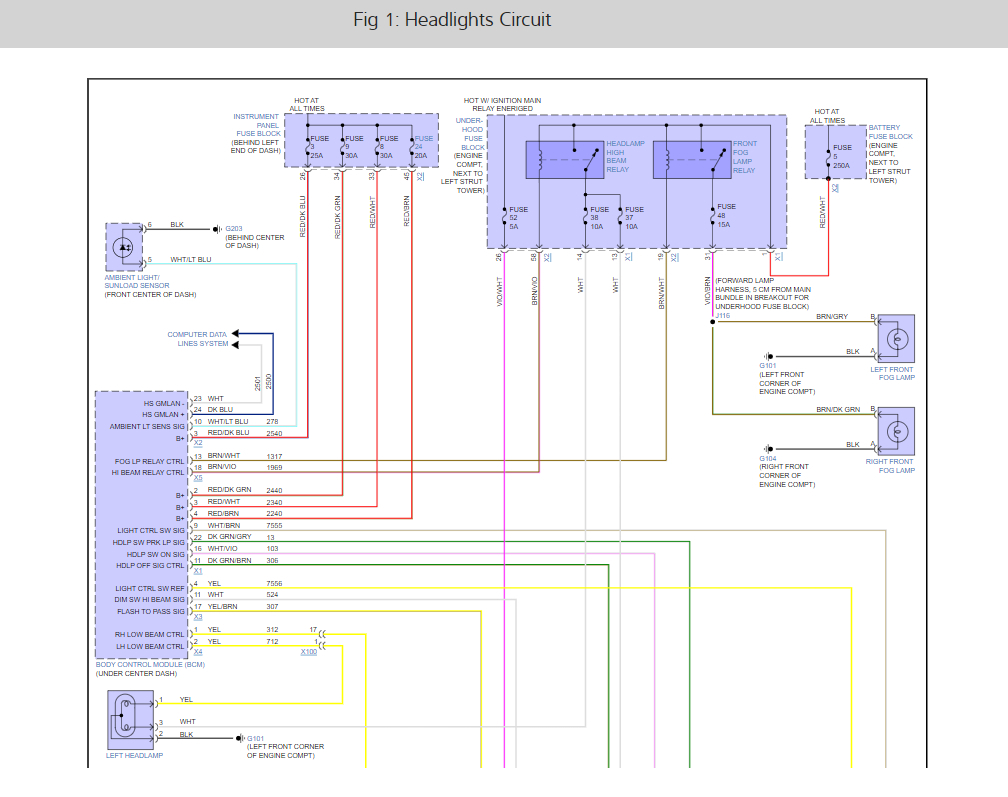 First we need to check the 5 fuses that run the system, # 3, 9, 8, 24 in the interior fuse panel and fuse # 52 in the under-hood fuse panel. Here is a guide to help and I have included the fuse locations and the headlight wiring diagrams so you can see how the system works: