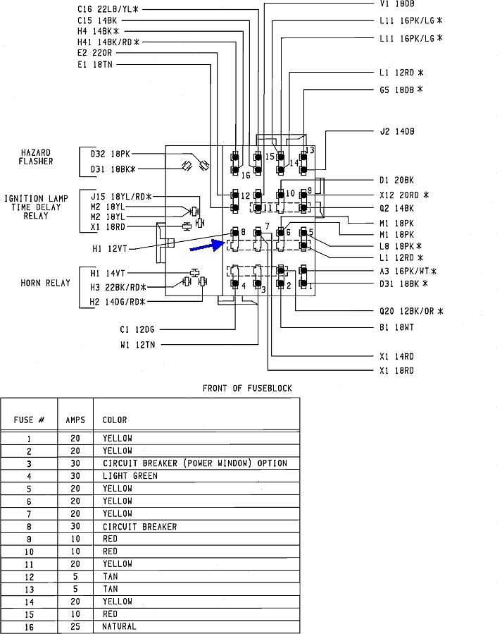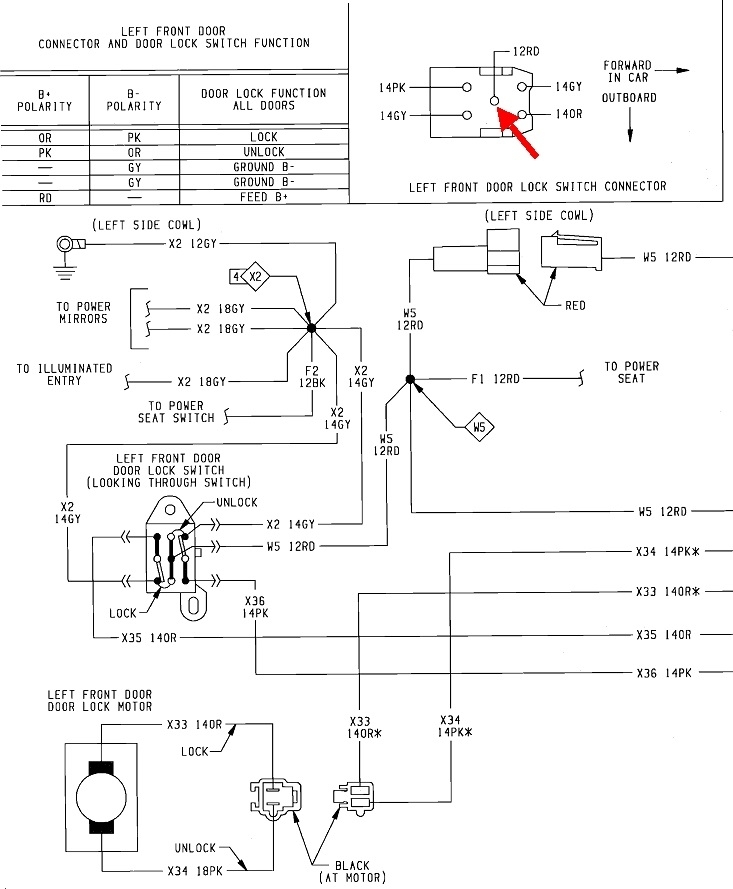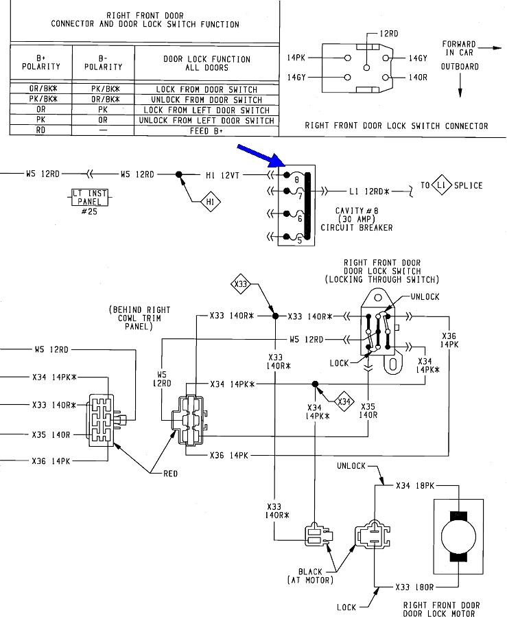 You can find these tools at Harbor Freight Tools, Walmart, or any hardware store, for less than ten dollars. The best place to take the first reading is on the red wire in the power lock switch connector, but you'll need to figure out how to pop the switch out to get to it. Instead, you can also start at the circuit breaker. Pull it out, then check for 12 volts in its socket. You should find 12 volts on one of the terminals all the time. This is circuit breaker # 8, blue arrow in the third drawing. If you find 12 volts there, we have to get to the switch connector next. 12 volts should also be on the read wire in that connector, (red arrow in the first diagram).