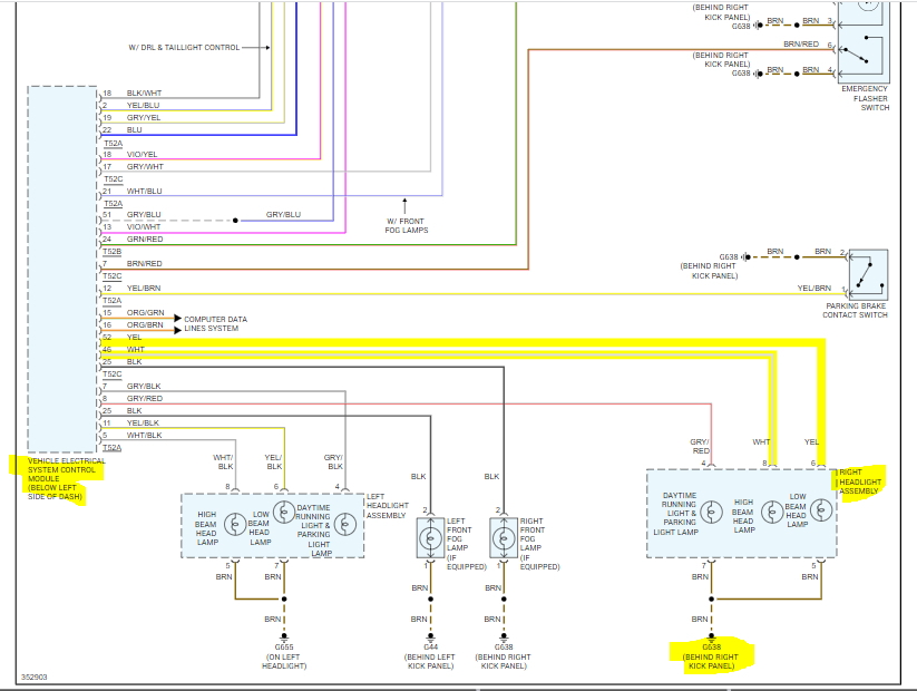 With the low beam lights on, check to see if there is power to the yellow wire. Then, check the same on the white wire with the high beam lights on. If you have power, then we need to check the brown wire.