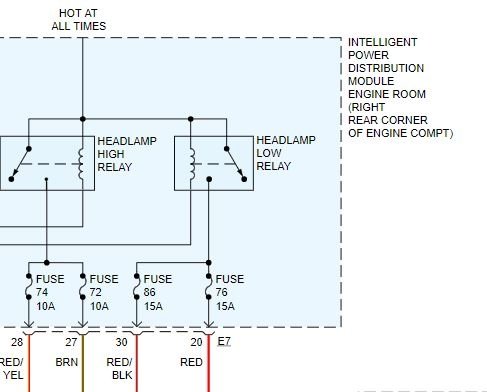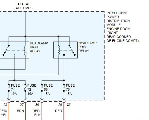I am not sure why, but I do not have a layout of the fuse box or relay box, so I had to look through schematics. Under the hood, passenger side rear, is the relay box. First, for the low beam, check and confirm fuses 76 and 86. If they are good, confirm fuses 72 and 74 are good.