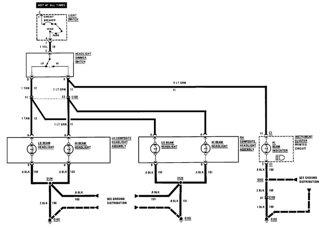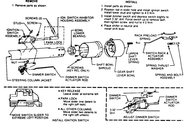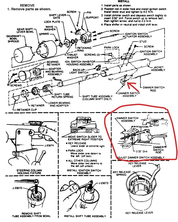 OK, so you turn on the switch and moving the dimmer switch the high beams work, but the low beams don't. Did they work before and both stopped at the same time? This is a simple system, the same fuse and switch powers both so those are OK, they share the same grounds as well. That leaves blown bulbs, a bad dimmer switch or both sides wiring failed. Out of those I would check the bulbs first, then while you are checking them you can test the dimmer while you are at the lamps. Go to one of the headlights with a simple test lamp. Connect the lamp to a ground and test that it works by touching battery positive. Next turn on the headlights and select low beam, now unplug the connector on the low beam bulb and touch the terminal in the plug that has the Tan wire. With the low beams on if there is power at the tan wire then the bulb is bad, if not then we need to test the dimmer switch. There are two different columns but both use a switch mounted on the column under the dash. Both are tested the same way. Take the test light and attach it to a good ground, with the switch plugged in, turn on the headlights, on high beam, the large tab connected to the Yellow wire will have power. Touch the test light to the terminal with the Light Green wire, it should light, select low beam, the other terminal with the Tan wire should light, if it doesn't the switch has failed. They are a simple switch but the contacts can burn out or the lever in the switch fails. Attached are both versions of the column instructions, the switch itself mounts and operates almost the same, both use a drill bit or other 3/32 rod for alignment.