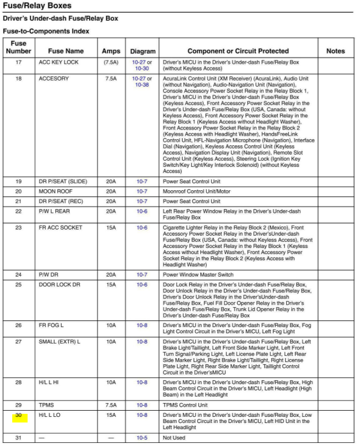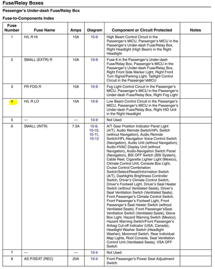 There is also a 15A fuse for each low beam headlight. The driver side low beam fuse is in the fuse box under the driver side dash and the passenger side fuse is in the fuse box under the passenger side dash.