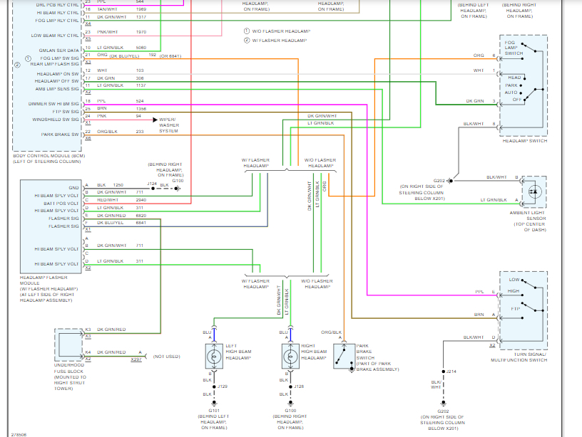 Bulbs are good. Fuses are good. Daytime running lights and fog lights work. Removed headlight assembly to test power and ground. I have power on both pins on both sides. Could this possibly be a grounding issue? If so, where do I find the ground for headlights?