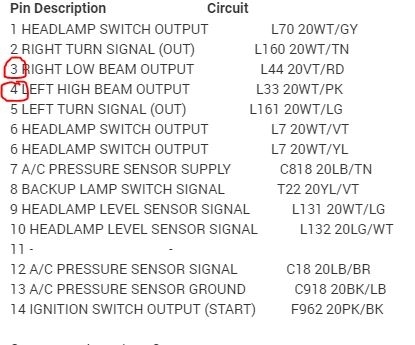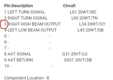 I attached a picture of the right side power supply plug for the headlamp. What I need you to do is simply check pins 1 and 3 for power. Pin 1 should have power with low beams and pin 3 should have power for high beam. Pin number 2 (center) is ground.