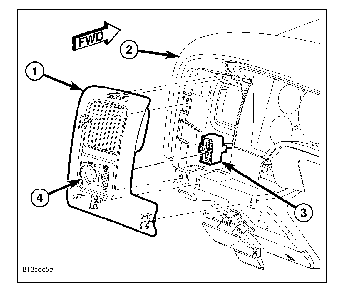 3. Position the left bezel (1) close enough to the instrument panel (2) to reconnect the instrument panel wire harness connector (3) to the back of the headlamp switch (4).