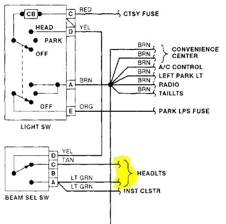 Let's start with the basics. When the issue is present, start by checking for power at the headlamp switch. This should be the red wire at the switch connector (see first attachment). From there, you can follow the circuit through the headlamp switch, to the beam selector switch and finally to the headlamp bulbs. The highlighted sections on both diagrams indicate where the circuit leads from the first page to the second. If you don't have power, you'll need to check the courtesy fuse to see if power is present there.