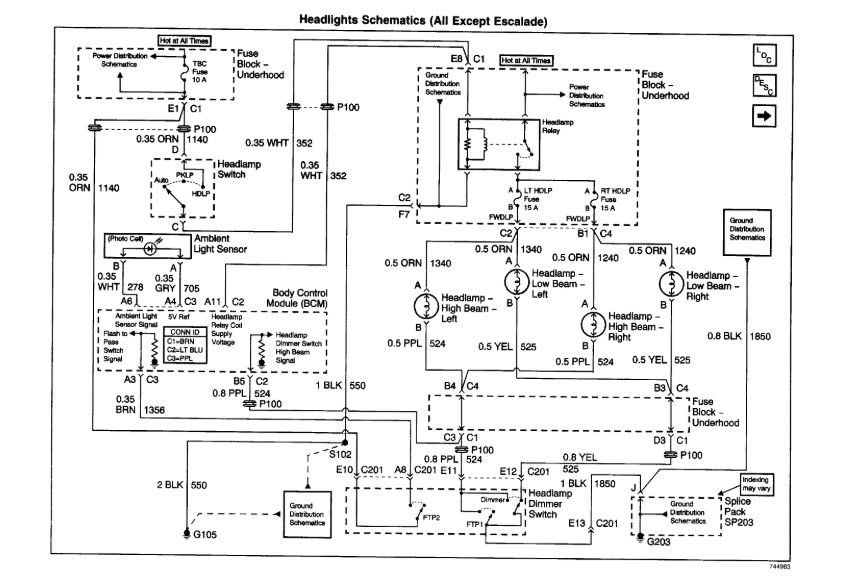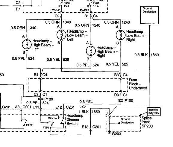 Have no high or low beams. Orange power is working. Headlight switch turns that power on and off. Ground seems to be the problem but can't figure out how/why. Book shows yellow and purple ground being switched at the dimmer but when I test both, they are both showing a ground all the time. I put a new dimmer in and seems the same. Only wire that switches on and off ground is brown which is "flash to pass". I don't mind putting in new wires but I cant even figure out where to pull the wires from. I can't find a diagram of the dimmer switch either to figure it out. Please help