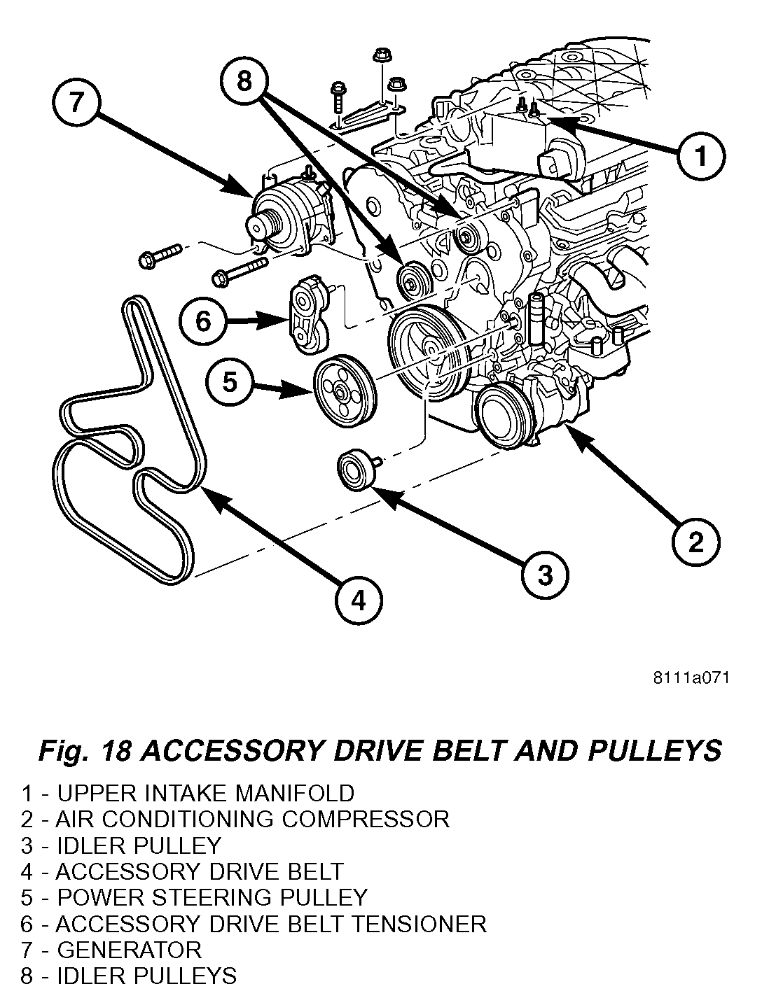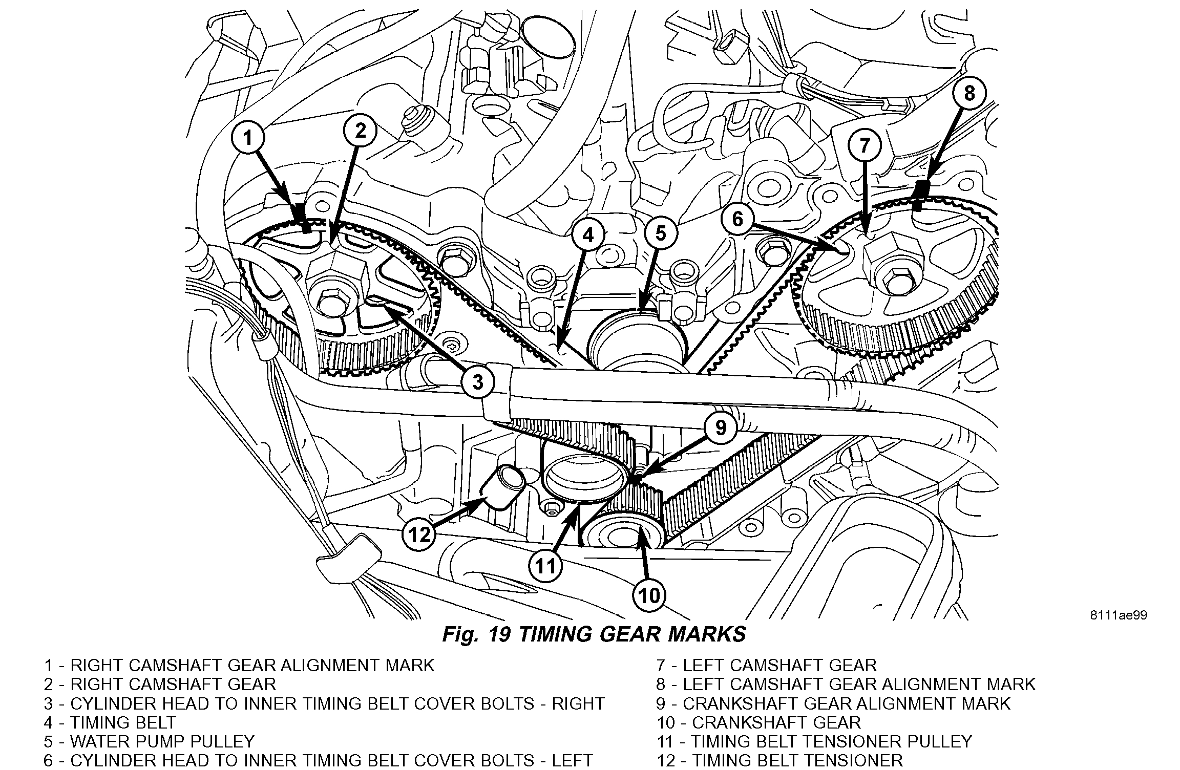 14) Remove the timing belt tensioner, timing belt, then reset tensioner (Fig. 19).