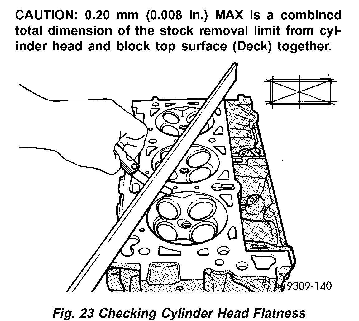 CAUTION: 0.20 mm (0.008 inch) MAX is a combined total dimension of the stock removal limit from cylinder head and block top surface (Deck) together.