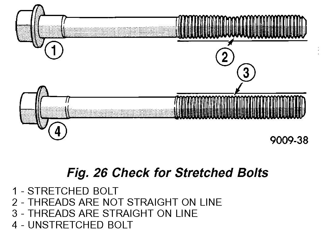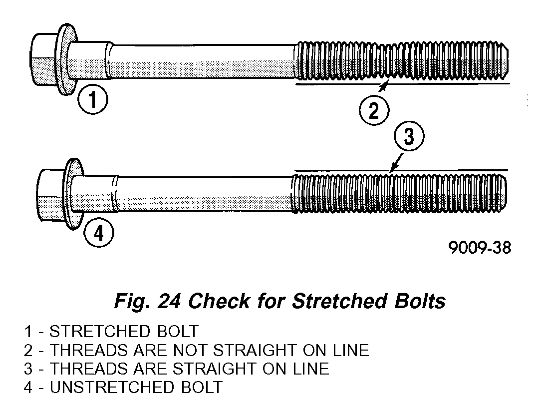 The cylinder head bolts are tightened using a torque plus angle procedure. The bolts must be examined BEFORE reuse. If the threads are necked down the bolts must be replaced (Fig. 24).