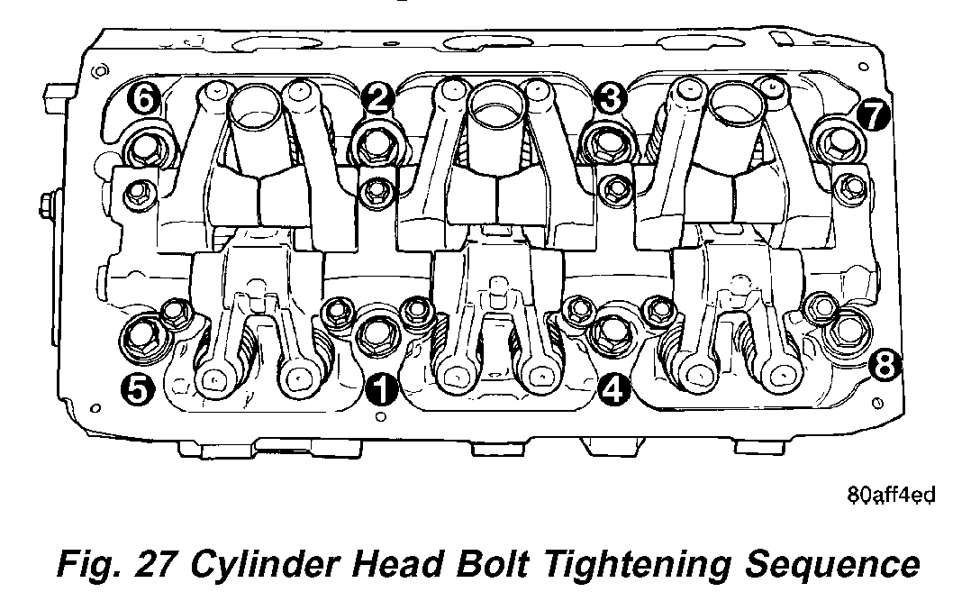 4) Tighten the cylinder head bolts in the sequence shown in (Fig. 27). Using the 4 step torque-turn method, tighten according to the following torque values: