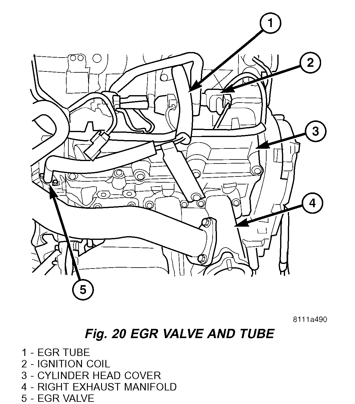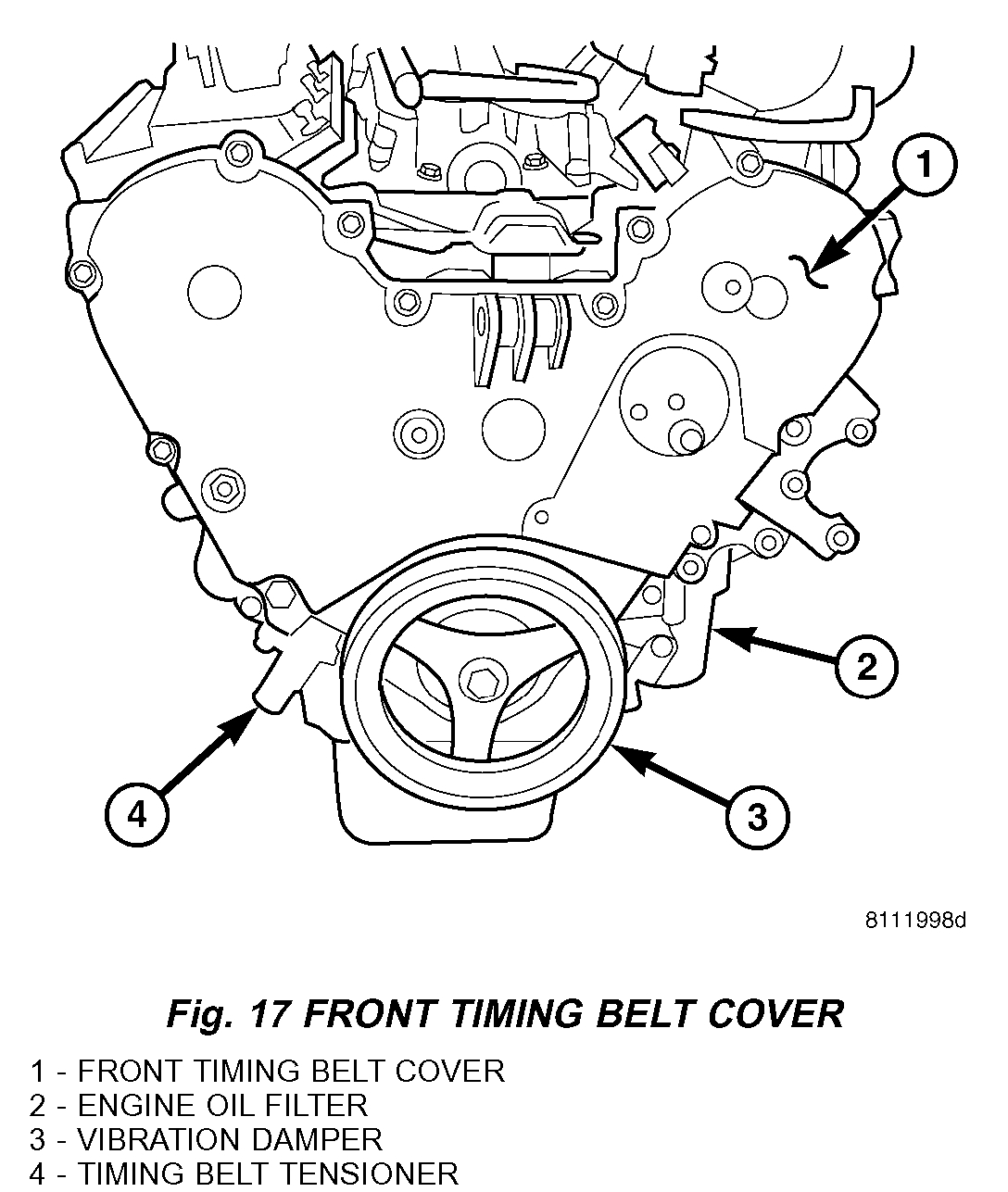 21) Remove the front timing belt housing to cylinder head bolts (Fig. 19).