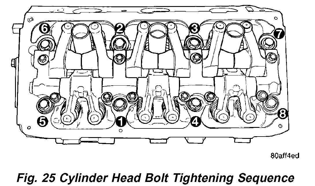 5) Tighten the cylinder head bolts in the sequence shown in (Fig. 25). Using the 4 step torque-turn method, tighten according to the following torque values: