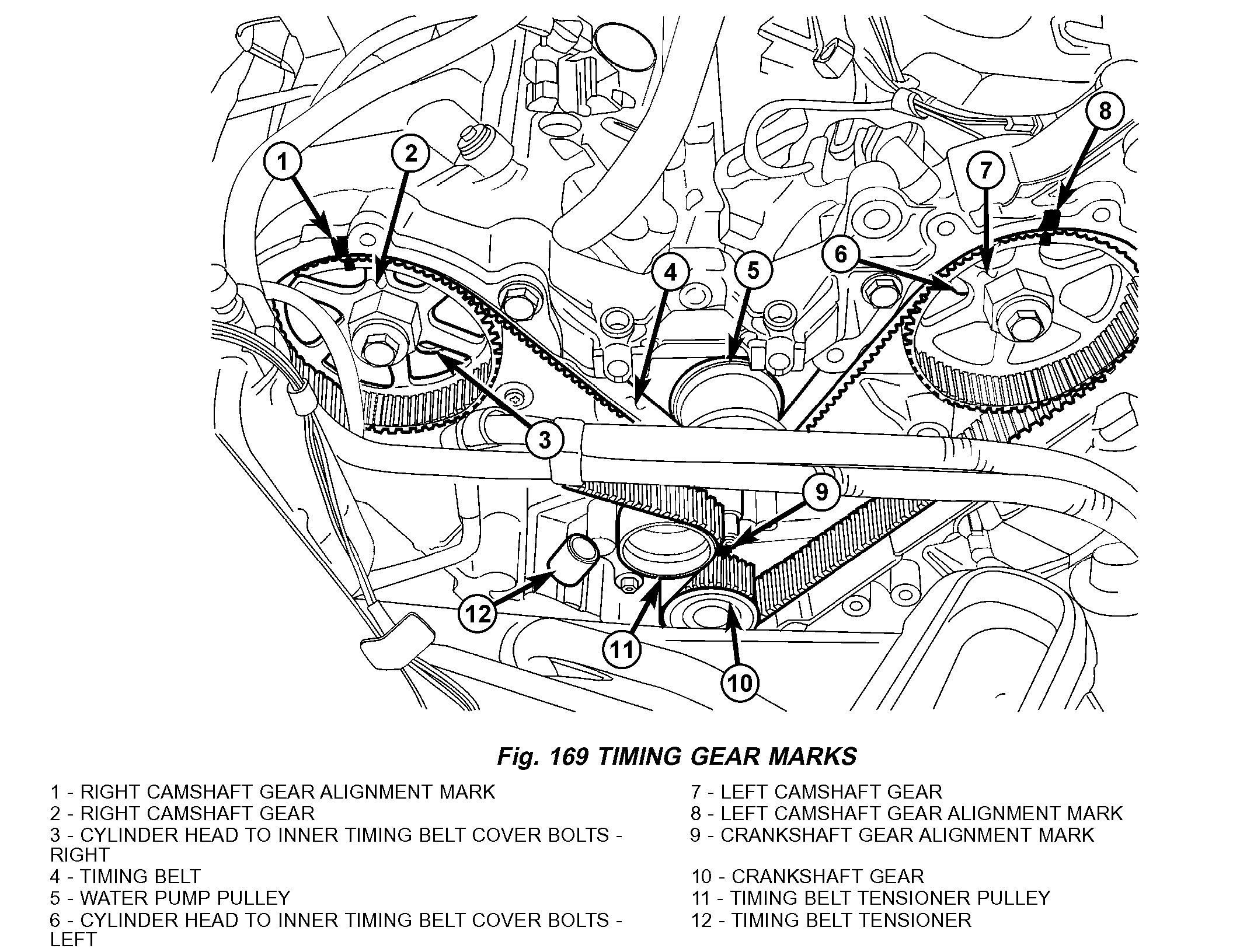 Remove the outer timing covers. Rotate the crankshaft until the pointer on the crankshaft sprocket aligns the TDC mark on the oil pump. Check to determine if the camshaft sprocket timing marks are aligned with the marks on the inner timing cover. It may take an additional full revolution of the crankshaft before the camshaft sprocket marks are aligned (Fig. 169).