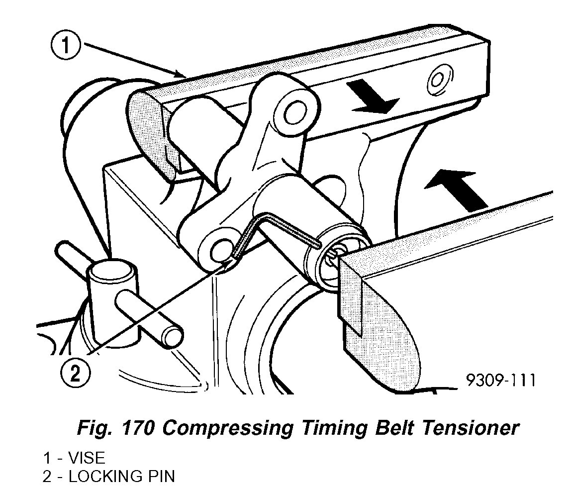 a) Place the tensioner into a vise and SLOWLY compress the plunger (Fig. 170). Total bleed down of tensioner should take about 5 minutes.