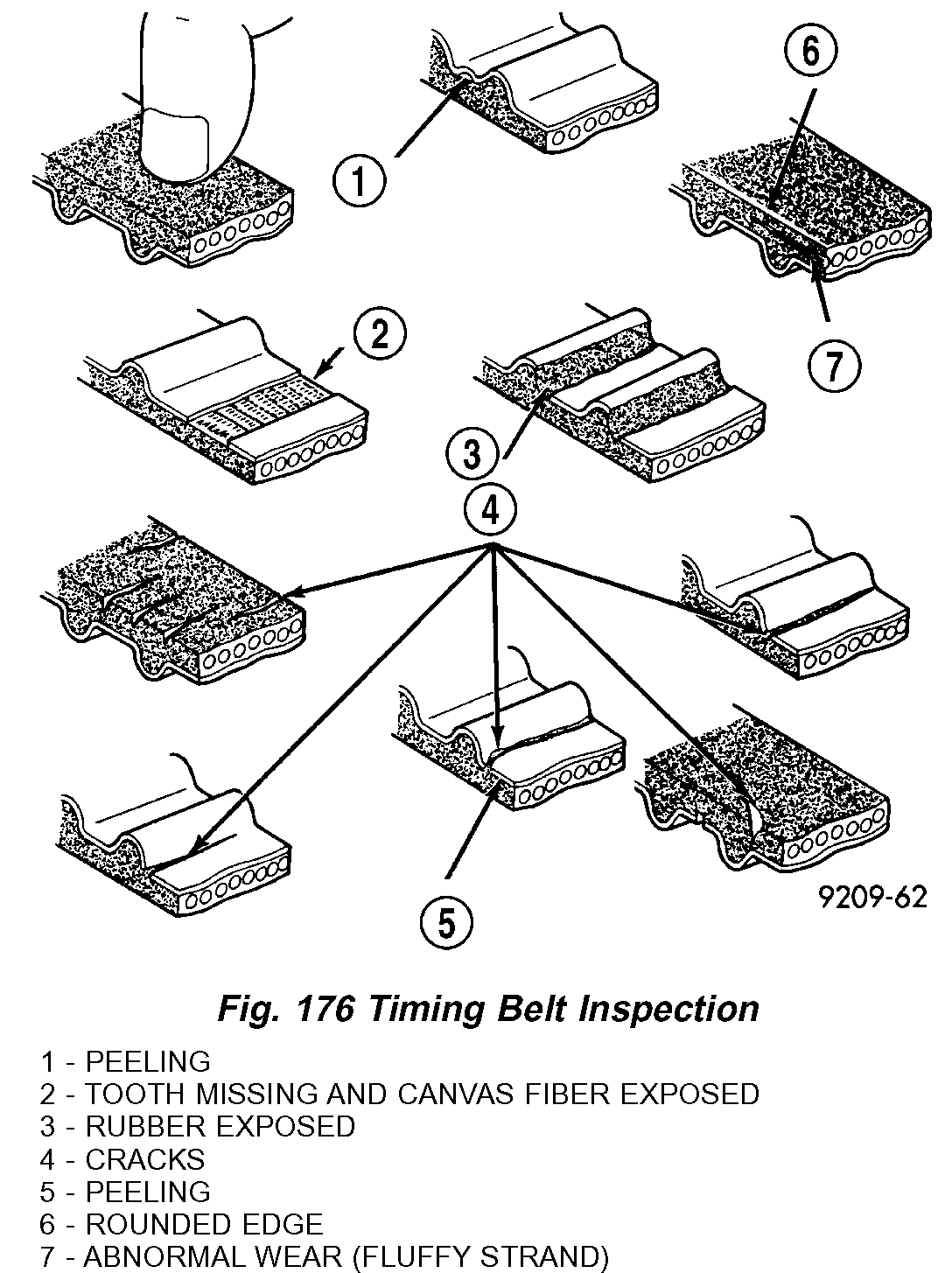 2) Inspect both sides of the timing belt. Replace belt if any of the following conditions exist (Fig. 176):
