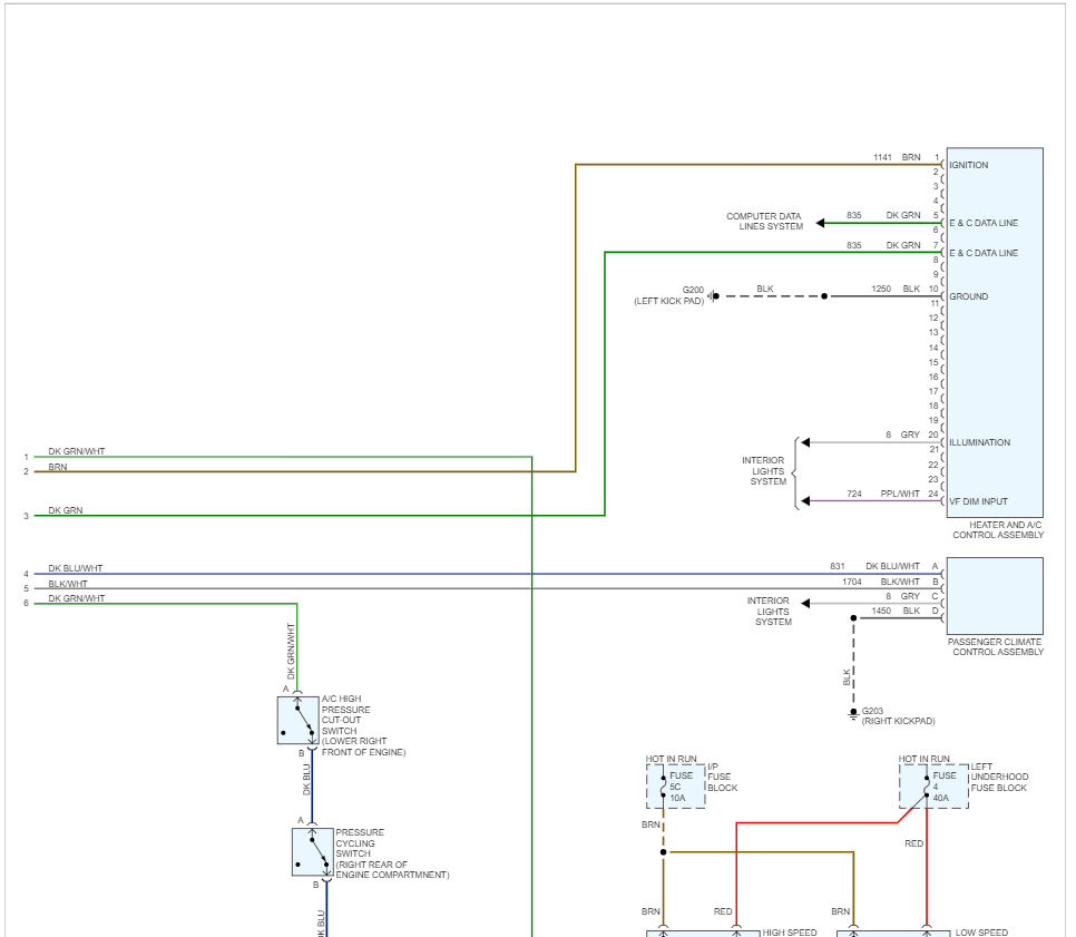 First my blower motor stayed on when the car was turned off, I disconnected the wire connection to motor to shut off. Sometime later I reconnected to troubleshoot, the motor came back on but shut down shortly after and would not come back on. Then a short time later the heater and A/C control panel shut down, it no longer lights up or shows outside temperatures, etc. I have checked all fuses under dash and under hood motor shows 8 to 19 ohms when tested. I tried to trace the purple and black wires coming from the motor but could not determine where they go once going through the firewall.