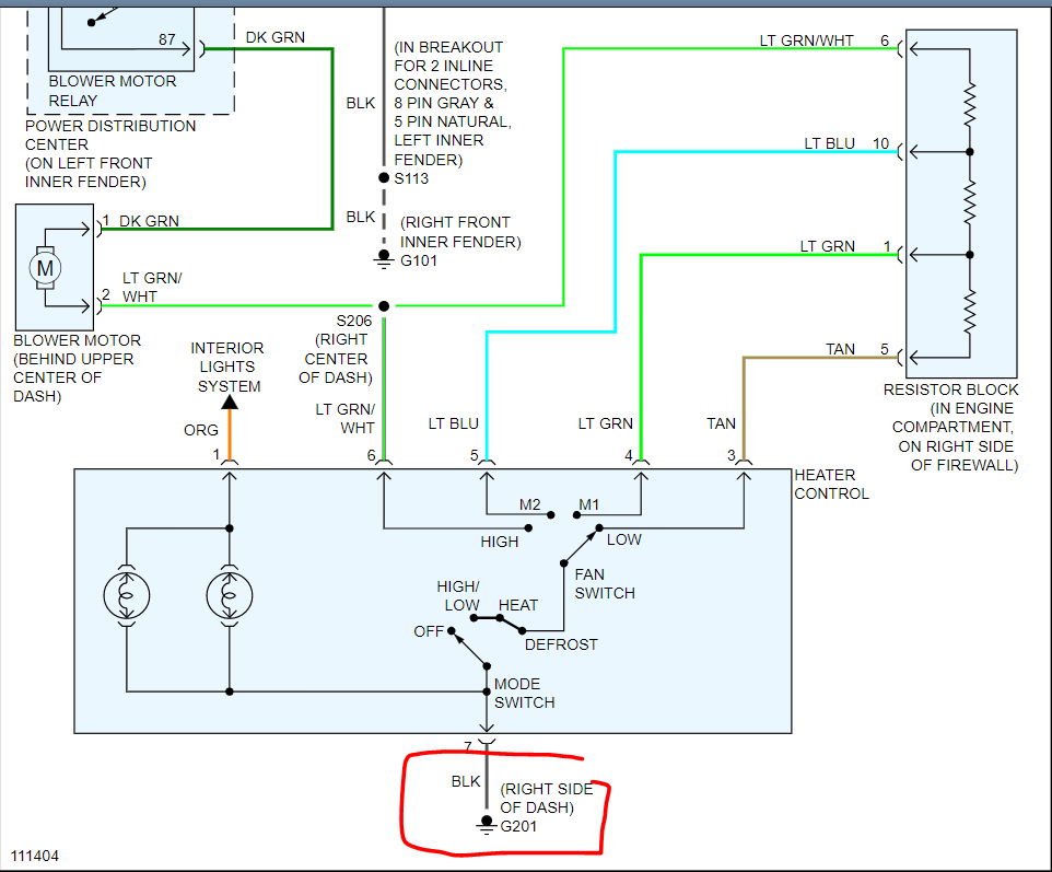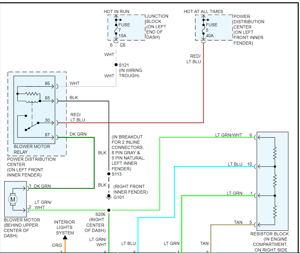 As far as the blower motor, power is introduced from fuse 5 in the schematic. It then goes to the blower motor relay, to the blower motor, then through the blower motor resister, to the switch, and then the switch provides a path to ground. Once the switch is turned on, the ground completes the circuit and the blower motor should run. Speed is determine by which portion of the resister power passes through to the switch.