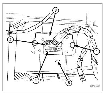Remove the two screws (4) that secure the blower motor resistor to the HVAC housing (5).