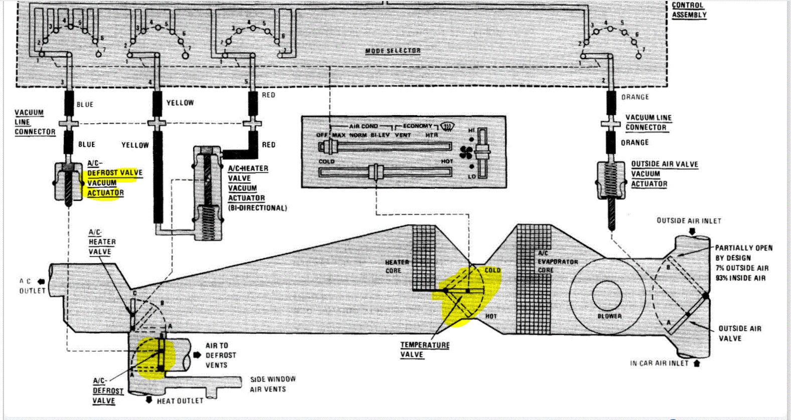 In pic 1, it identifies the component locations. If it is the temperature that is the issue, focus on the temperature valve. If the problem is airflow direction, focus on the A/C defroster valve.