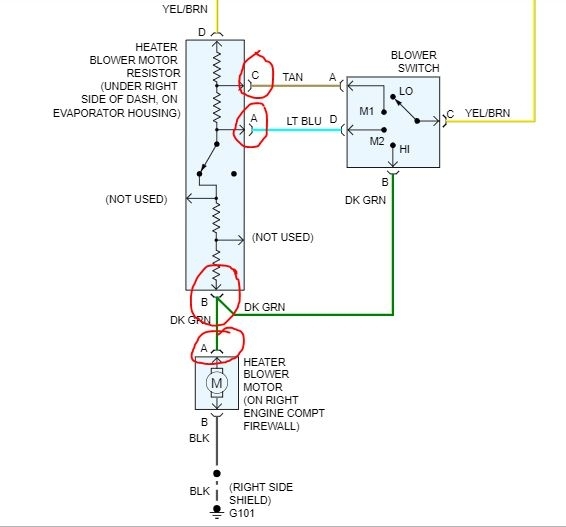 If there is no power, move back to the blower motor resister. Is there power letters A (lt blue) and C (tan) when the speed is in the select positions as indicated?