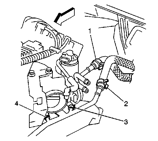 Remove the throttle body inlet (3) and outlet (4) hoses from the thermostat bypass pipe.