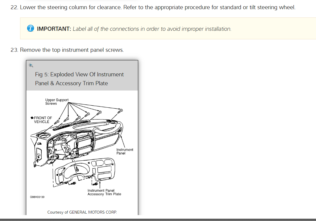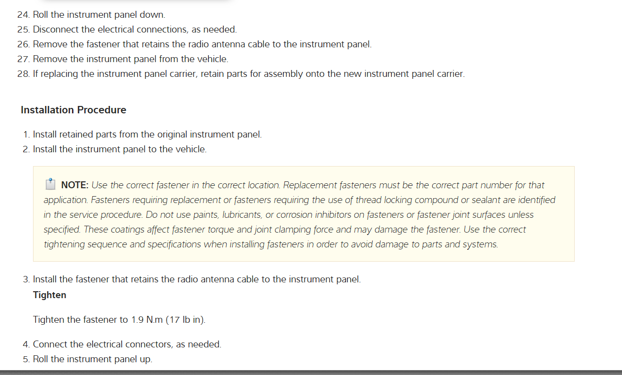 26. Remove the fastener that retains the radio antenna cable to the instrument panel.