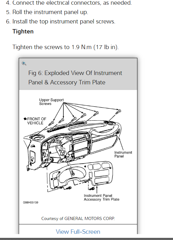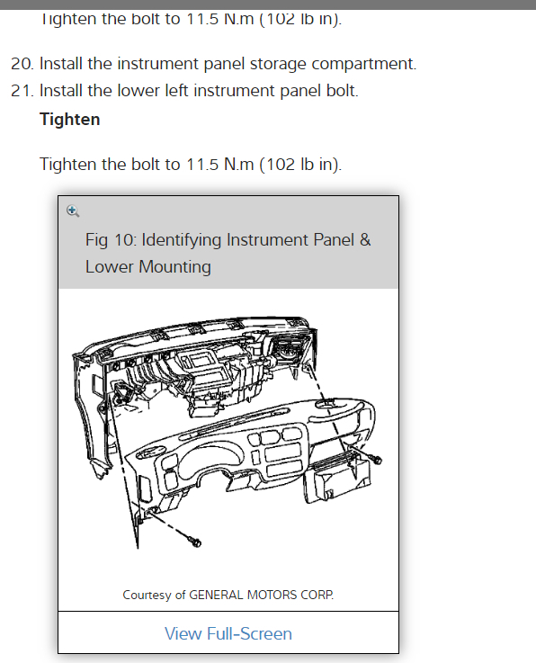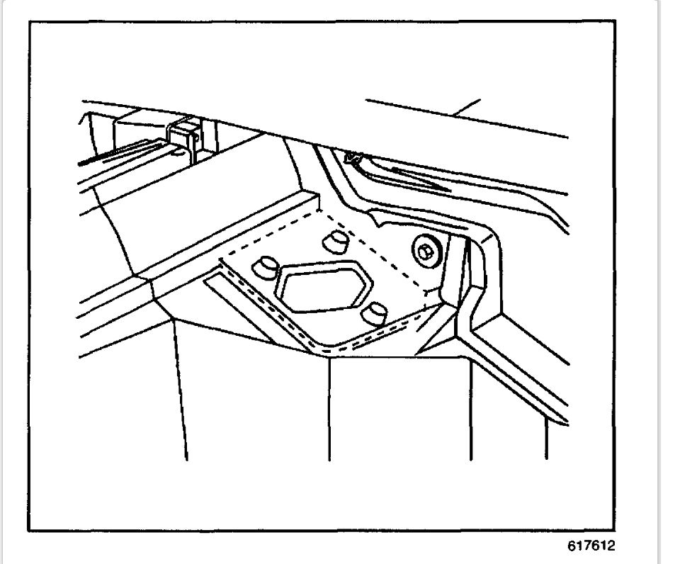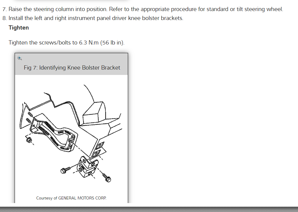 8. Install the left and right instrument panel driver knee bolster brackets. Tighten the screws/bolts to 6.3 Nm (56 lb in).