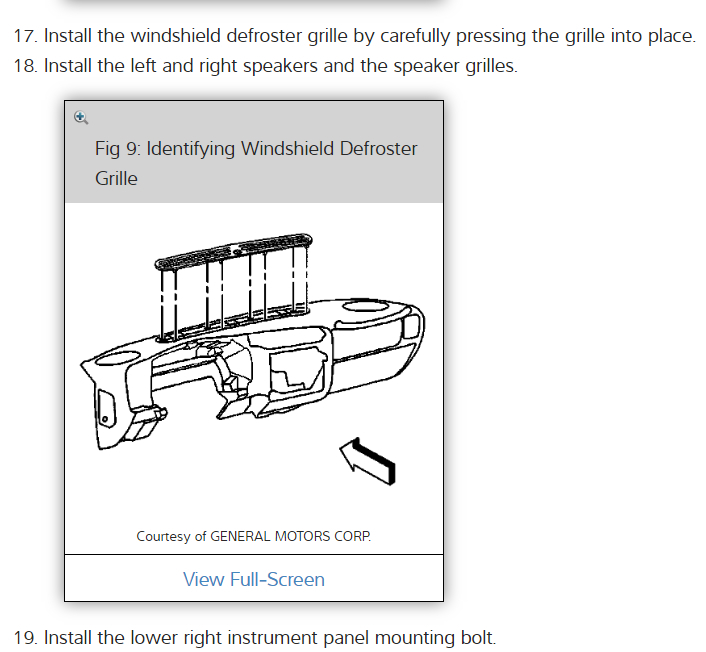 17. Install the windshield defroster grille by pressing carefully pressing the grille into place.