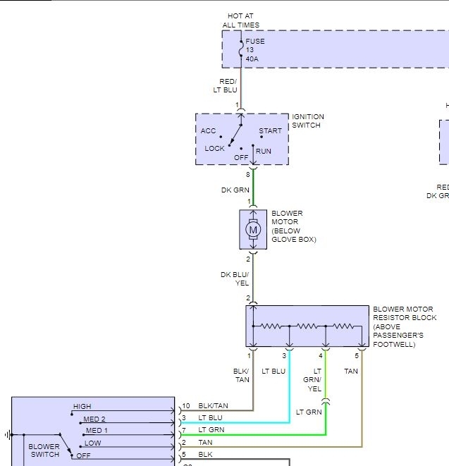 See if any voltage comes out of the wires of that resistor for low speed (tan wire), medium 1 (green/yellow wire) and medium 2 (light blue wire). Turn the key to run so the resistor has power.