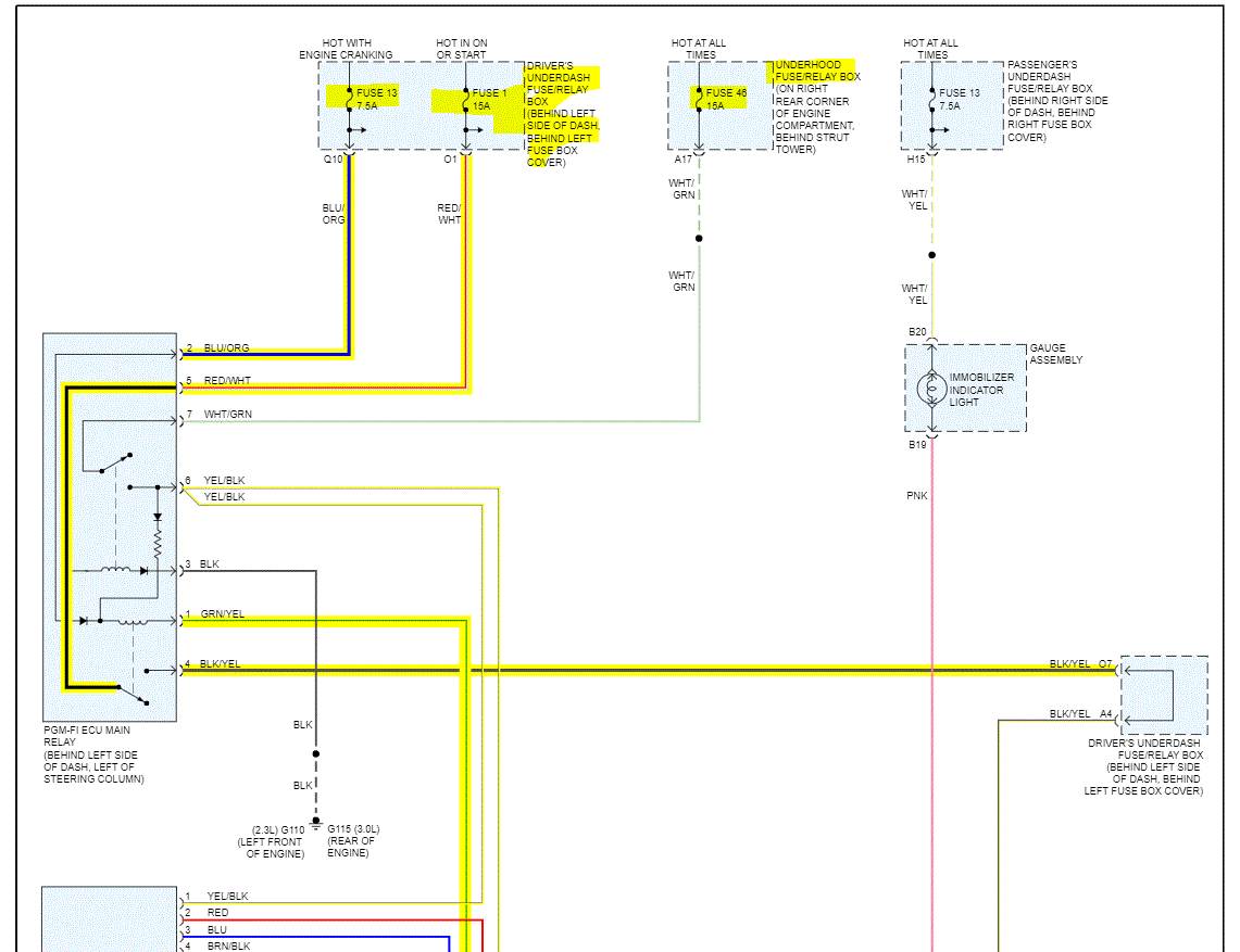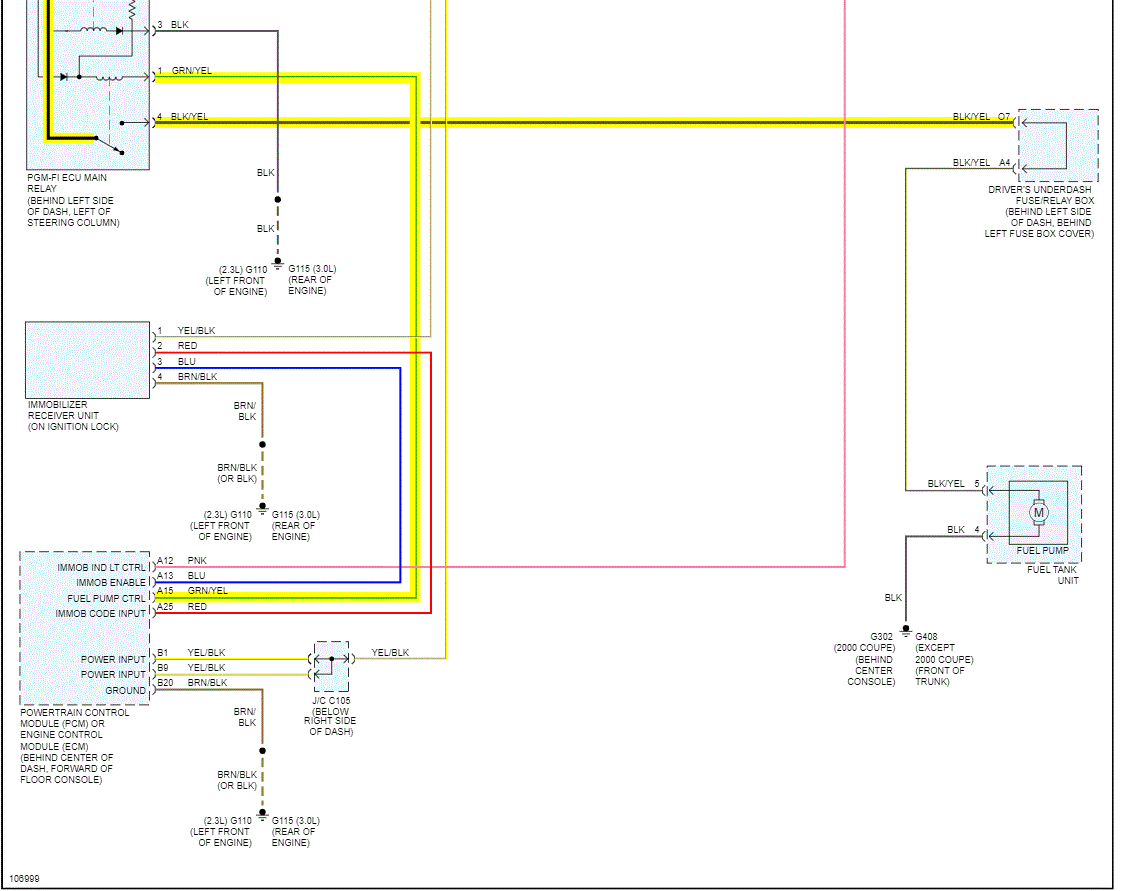 Also, I attached the wiring schematic for the fuel pump circuit and immobilizer. I highlighted three fuses. I need you to check them. In addition to checking the fuse itself, make sure there is power to and from the fuse. Here is a link you may find helpful: