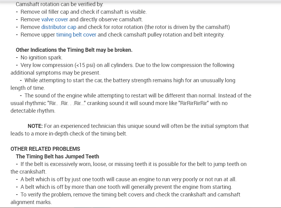 I saw where you answered a question about a car that is doing the same thing mine is. It will turn over. But I know a little about cars, but sent it to a shop were they gave us a bs story about it needing a new motor because a belt inside the engine was broken. I don't know what they were talking about, but it just didn't seem right what they were saying. Do you have any ideas?