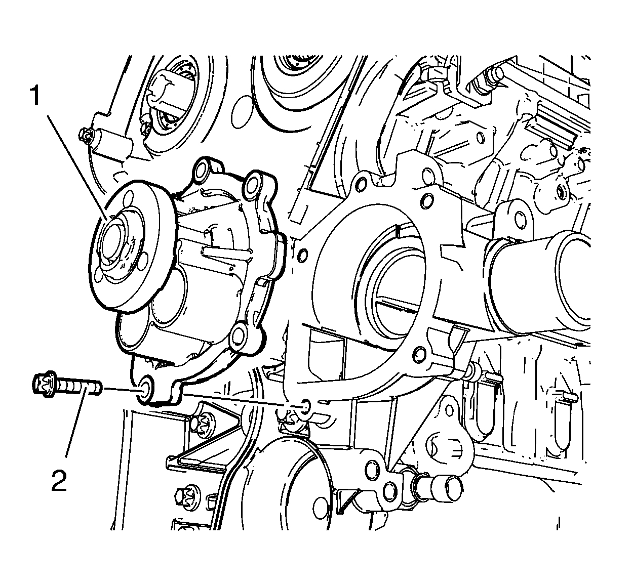 5. Install the 5 water pump bolts (2) and tighten to 8 Nm (71 lb in).