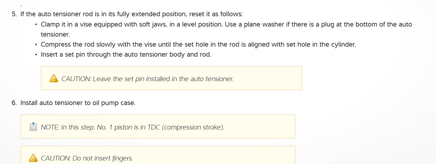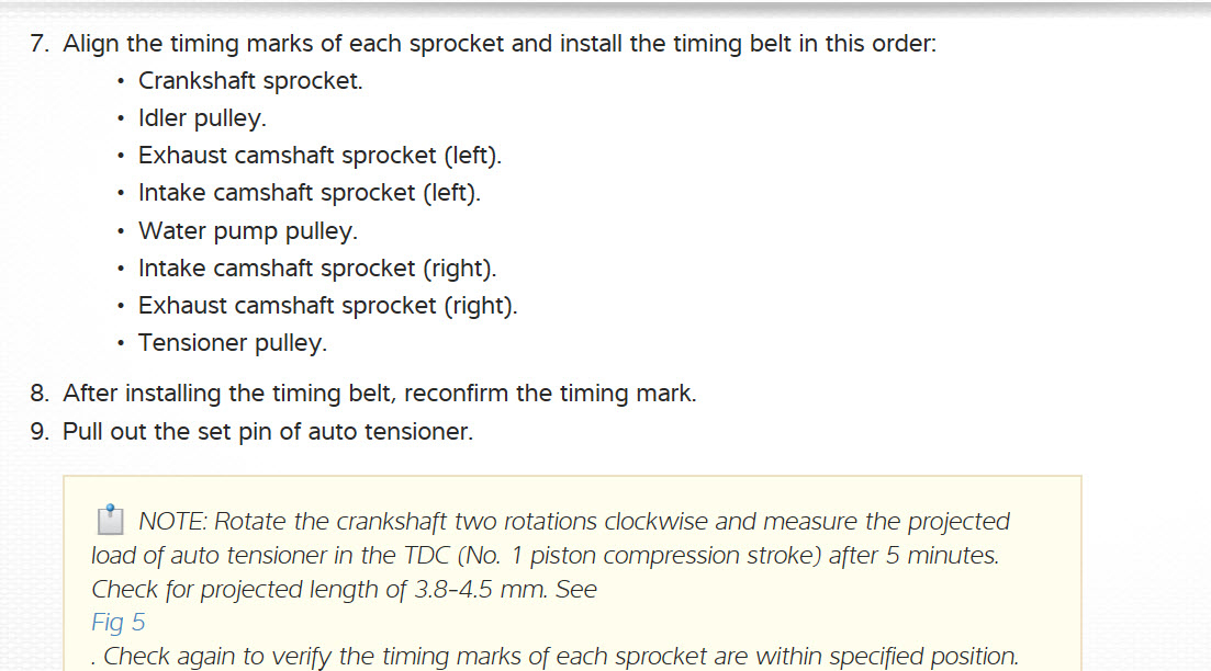 Finally, I checked under the top cover of of the timing belt: it looked fine(no slack). I decided to just take everything off to get to the bottom cover. Unfortunately when, I pulled the crank pulley the crankshaft sprocket came out too. It was at this point that I discovered that the bolt on the tension-er arm was broken. I then easy-outed the bolt, ordered the new bolt, pressed the tension-er pin back in, put belt back and bolted everything up.