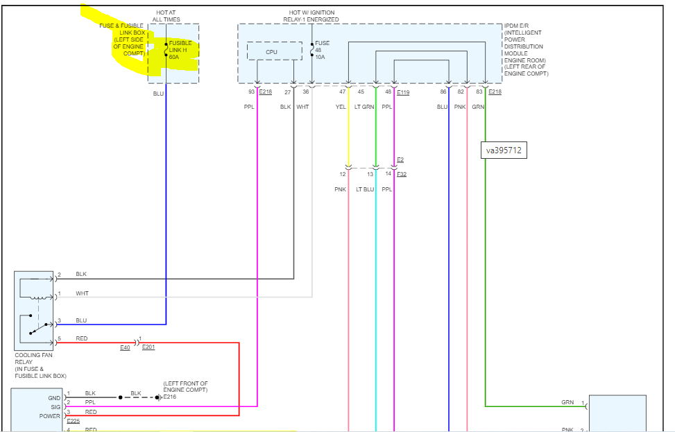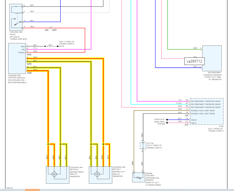 I attached a wiring schematic below for the radiator cooling fans. There is a fan control module that is part of the circuit. (Pics 2 and 3)