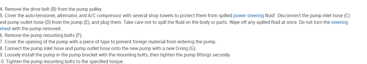 The only thing not mentioned in the directions, and I always do is this. Once everything is reinstalled, fill the P/S reservoir. Lift the front wheels slightly off the ground and with the engine off, turn the steering fully from left to right a few times. Do it slowly so you get more air out. Next, check the fluid. If it is low, refill it and do it again. Ultimately, you want the fluid to stabilize and to eliminate as many air bubbles in the fluid as possible.