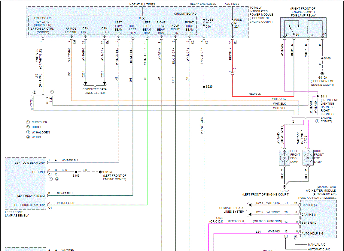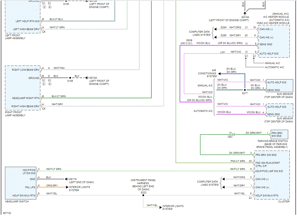 I attached two pics below which show the entire headlamp wiring schematic. Pic 1 shows the TIPM and you can see where the right high beam is powered from.