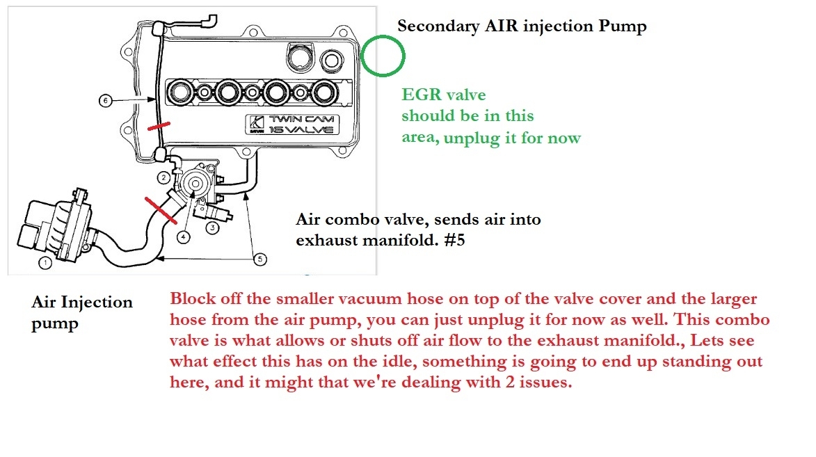The diagrams below 1-4 are for the P0410 code, Air injection, you might try clamping off or blocking off one or more of the larger air pump hoses or even just regular vacuum hoses off and see if it happens to bring the idle down or effect it in any way,