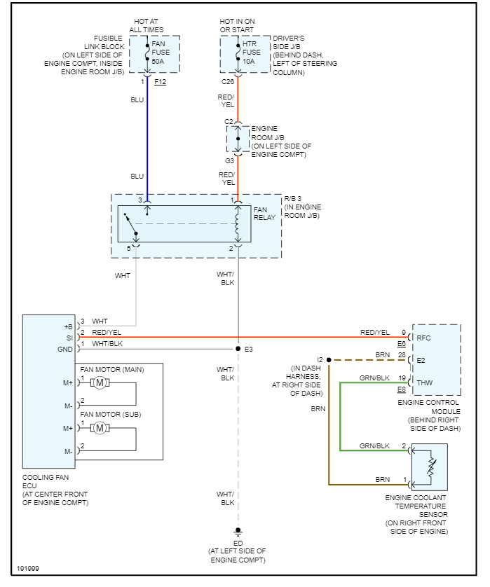 Vehicle has new water pump, thermostat housing, thermostat, aluminum radiator and cap. When idling, temperature rises well over operational (above 3/4 mark). Radiator fans do not hold high speed when temperature gets to operational (1/2 mark). Radiator fans engage on high speed briefly and suddenly disengage to normal speed although temperature keeps raising. Engine compression test passed. Vehicle lowers temperature when accelerated. Fan relay terminals 1 and 2 do not have continuity when pulled out of the box but do when installed and battery connected. I guess it is an “Normally Open Relay”? Might be the relay or the Coolant Temperature Sensor? Any help or suggestions will be greatly appreciated. Thanks in advance.