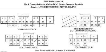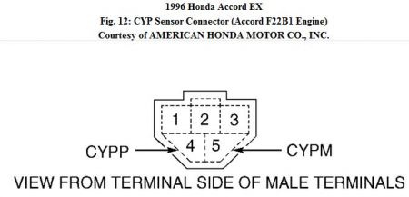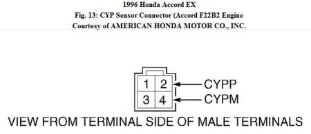 2 . On Accord (F22B1 engine), measure resistance between sensor terminals No. 4 (CYPP) and No. 5 (CYPM). See Fig. 12 . On Accord (F22B2 engine) and Prelude, measure resistance between sensor terminals No. 2 (CYPP) and No. 4 (CYPM). See Fig. 13 . On Accord, resistance should be 800 - 1500 ohms. On Prelude, resistance should be 500 - 1000 ohms.