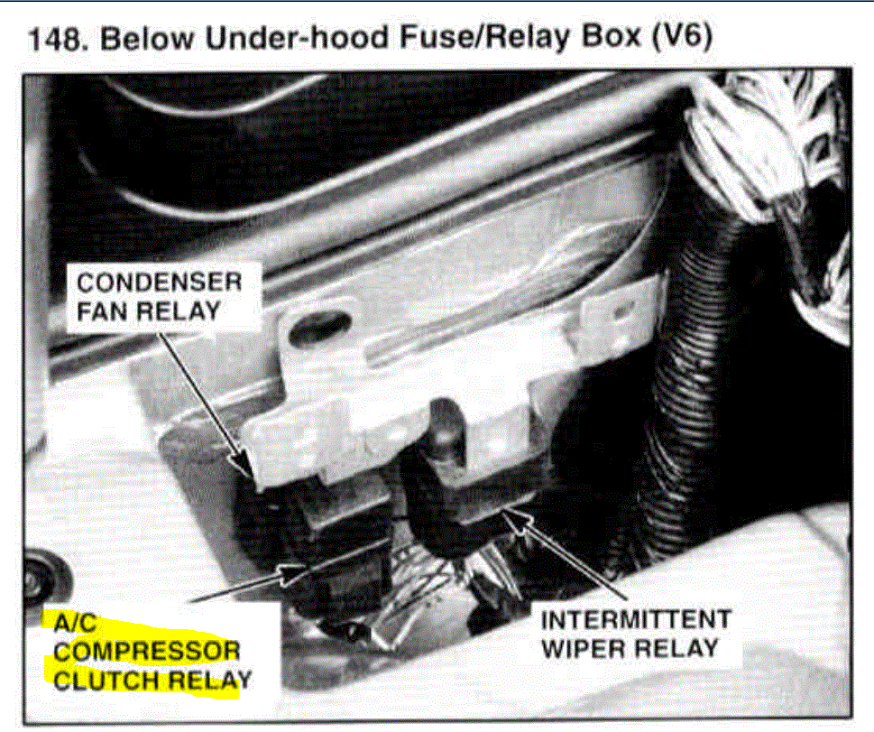 A relay can cause the compressor to not operate. This relay is located under the fuse/relay box in the engine compartment. See pic 1 below.