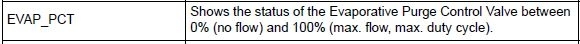 From yet another source I found this: "EVAP PURGE = EVAP_PCT: This parameter is displayed as a percentage and is normalized for all types of purge systems. EVAP Purge Control commanded OFF will display 0% and EVAP Purge Control commanded fully open will display 100%. This is an important parameter to check if the vehicle is having fuel trim problems. Fuel trim readings may be abnormal, due to normal purge operation. To eliminate EVAP Purge as a potential contributor to a fuel trim problem, block the purge valve inlet to the intake manifold, then recheck fuel trim."